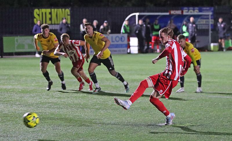 Bowers and Pitsea picked up their first home League win of the season- and they did so in some style, sweeping aside the challenge of Mildenhall Town. Joe Burton headed home a corner to give the hosts the lead midway through the first half, and six minutes before the break Mike Faulkner made it two. Only two minutes later the Len Salmon faithful were treated to a third, Kai Redgrave with that one, and after the break Faulkner took charge, adding a fourth on the hour and completing his hat trick from the spot nine minutes later. Bowers climb to eleventh.