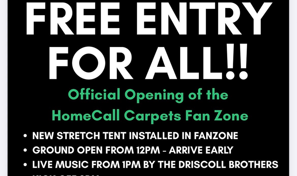 As you may know, the Hillians have presided over enormous improvements to their ground this season, and the latest innovation will be the opening of the Homecall Carpets Fan Zone- as you can see from the poster below. They'll also have music from the Driscoll Brothers, who we suspect are not the South London gangsters from Only Fools and Horses, as we don't recall them being particularly musical.