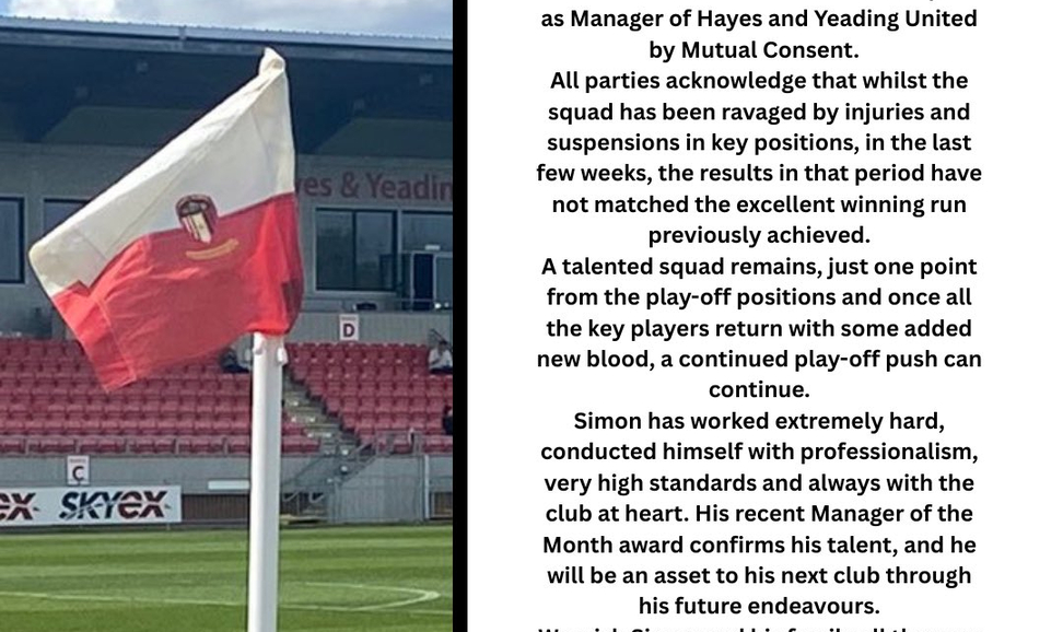 Hayes and Yeading United have announced the departure of manager Simon Lane- who was our Pitching In Isthmian South Central Manager of the Month as recently as September.