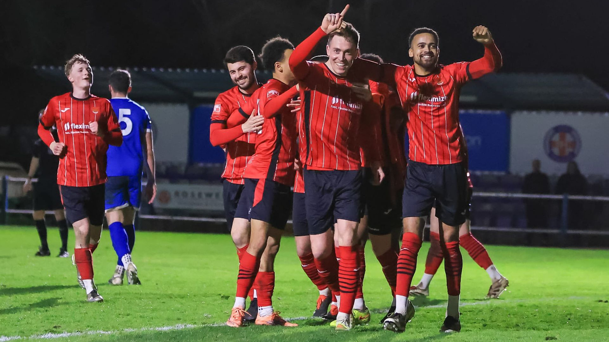 Eight place Wroxham were only three points away from the top five and hope to reduce that margin as they headed to Grays Athletic, but it was the hosts who took the points, despite playing much of the match with ten men. A red card for Ethan Cann looked to leave Athletic with an uphill struggle, but a goal from Caiden Remy-Dee delivered the points fifteen minutes from time. Athletic open up a five point gap between themselves and the drop zone.